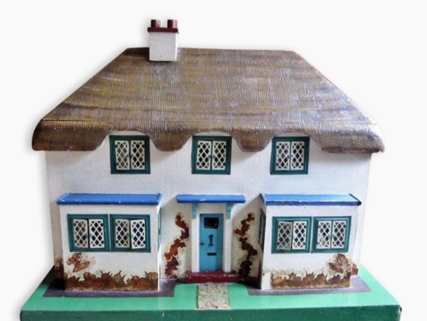 "Princess Elizabeth and Margaret's doll house" - double front thatched cottage with leaded light windows containing a quantity of furniture and accessories to include tinplate range, washing machine and mangle, etc, 73cms wide
