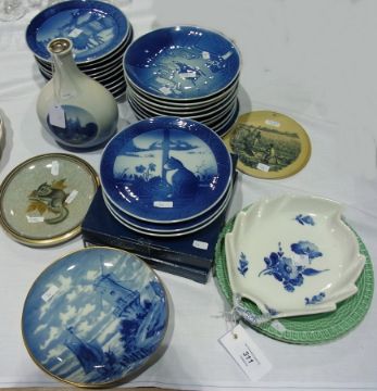 Royal Copenhagen pottery crackle glaze circular dish, painted with squirrel on a branch, large quantity Royal Copenhagen and Bing & Grondahl Christmas plates, Royal Copenhagen leaf-shaped dessert dish painted with floral spray, in underglaze blue and sundry ceramics