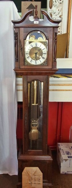Emperor mahogany grandmother clock, with broken swan-neck pediment, brass moon phase dial, having chiming and striking movement, with glazed door to the trunk, on bracket feet, 192cm high approx.