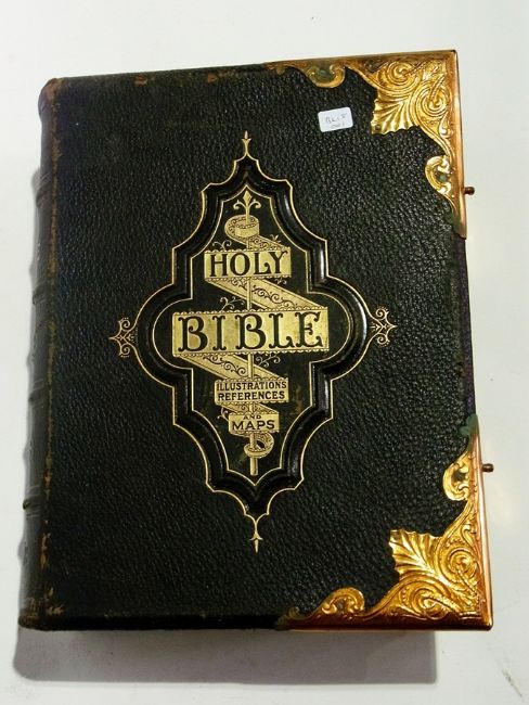 Victorian family Bible with brass corners and clasps and Victorian lithographs