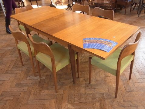 A set of Mogens Kold Mobelfabrik, Copenhagen 1960's twelve plus three teak dining chairs and the extending dining table, each chair with curved and arched shoulderboard, three chairs with woven rope-twist seats, all with turned tapering supports, the table rectangular, draw-leaf with two folding central sections, on straight supports, opening to 206cm long