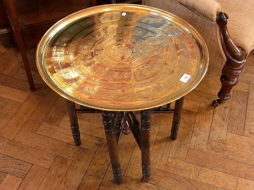 Eastern brass tray-topped table on turned wooden folding base, 58cm diameter