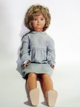 20th century large American vinyl walking girl doll with sleep eyes, closed mouth, wearing dark blonde wig and checked dress, 90cm