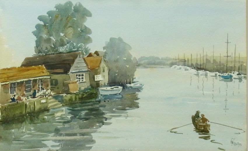 20th Century English School Watercolour drawing Figures rowing on river with buildings and people on shoreline, signed indistinctly "M H K Eillys"? 23cm x 48cm and feeding the geese print