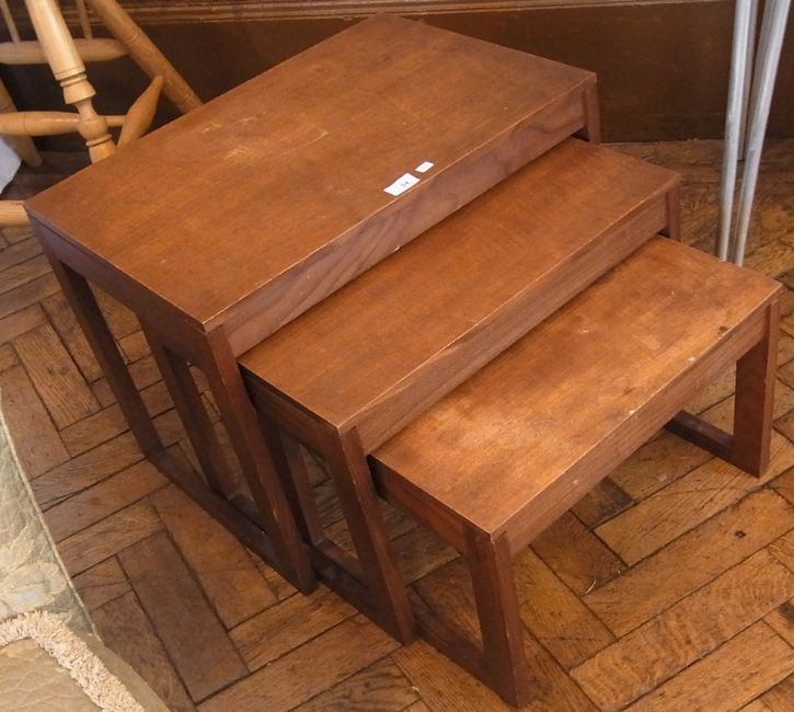 A nest of three hardwood occasional tables, on square supports, 61cm wide