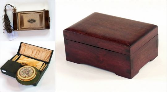 A "Princess" lady's compact in the form of a camera, a Rex mirror-backed compact, green leather jewellery box and a toiletry box (4)