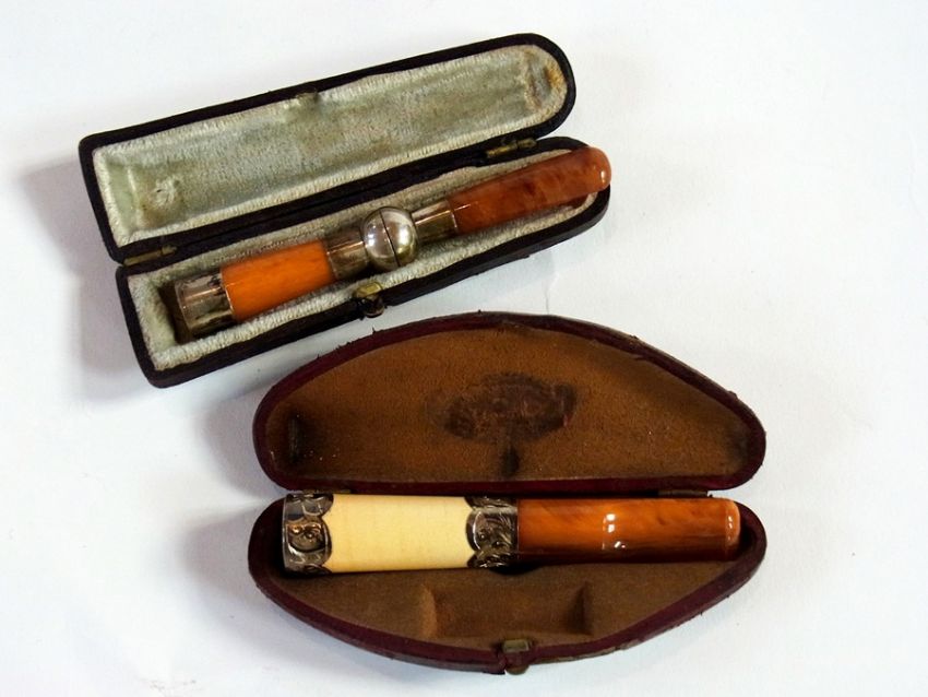 Edwardian amber and silver mounted cheroot holder, Birmingham 1906 and a meerschaum and amber silver mounted cheroot holder (2)