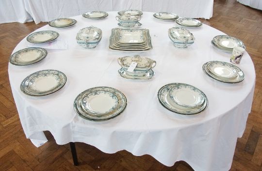 Quantity Victorian pottery dinnerware "Milan" pattern including six graduated shaped rectangular serving plates, two covered tureens and two sauce tureens on stand