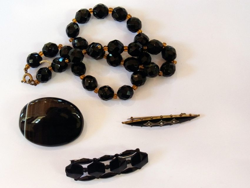 Black onyx oval brooch, black enamel and seedpearl bar brooch, French jet brooch and a black faceted necklace (4)