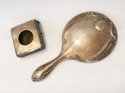 A silver-backed hand mirror, a silver watch case, Birmingham 1909 and a silver capped glass hair tidy jar, London 1924 (3)