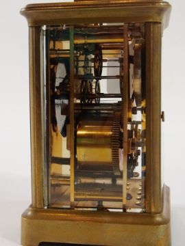 French brass striking carriage clock, back plate marks Hy Marc, Paris, the white enamel dial bearing retailers name, Charles Nephew & Co, Calcutta together with morroco leather carrying case, 7cm high overall