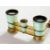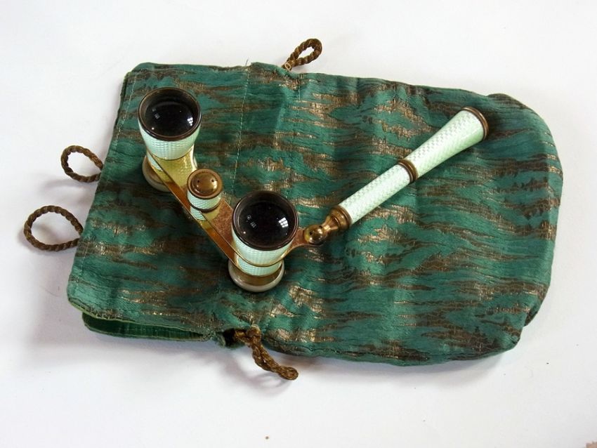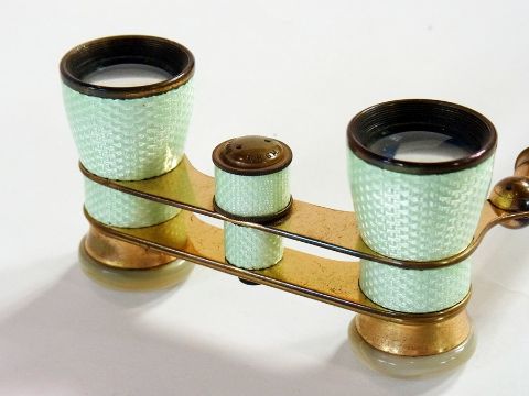 Pair of German pale green engine-turned enamel folding opera glasses, marked Busoh Multinett, having mother of pearl eye pieces in woven bag