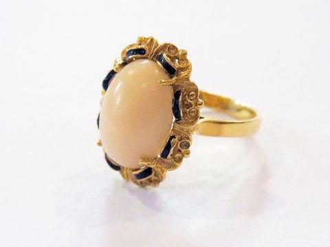 18ct gold coral, blue enamel, diamond and ruby demi-parure of three pieces viz:- necklace set seven tear-shaped corals and cluster of seven rubies, bracelet set 13 corals and ring set coral and having surround of blue enamel bars, all rococo style with openwork scroll surrounds, gross weight 65g approx.