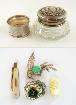 An Edwardian cut glass dressing table jar with Art Nouveau silver lid, Birmingham 1902, a 19th century silver snuff box of rectangular form with engraved line decoration and lined central cartouche, Birmingham 1915, a silver napkin ring, a silver plated preserve spoon, mother-of-pearl miniature folding fruit knife and small quantity of costume jewellery