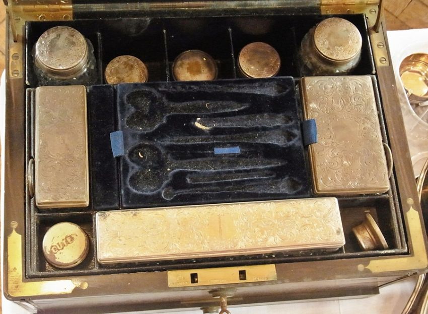 Victorian coromandel travelling vanity case with brass banding and lock marked "S Mordan & Co", having fitted interior, consisting of fall-flap revealing mirror and letter pouch, lift-out tray, with lift-out manicure fitted section above, bottle compartments behind, box with drawer beneath with watch holder and ring section, containing part set of cut glass jars with engraved silver lids, all marked London 1854, 9cm wide Live Bidding: Severe damage to exterior of box and lacking contents to interior