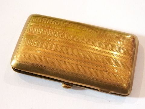9ct gold cigarette case, rectangular and engine turned, 8cm wide, 39g approx.