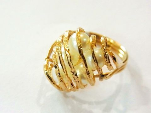 14K gold and cultured pearl ring, the openwork gold hoop surround set five pearls