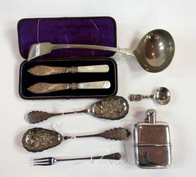 A pair of Victorian silver plate presentation butter knives with mother-of-pearl handles, cased, pair of salad servers, a pickle fork, a Lincolnshire caddy spoon, a fiddle pattern ladle and a hip flask