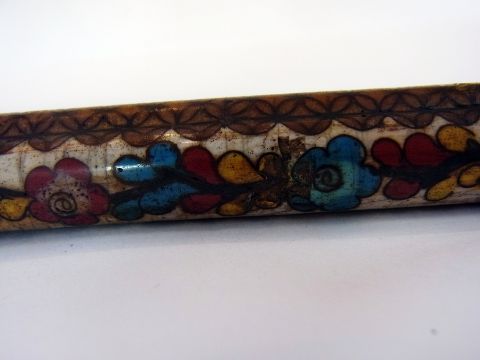 Chinese chopstick set comprising pair ivory chopsticks and wooden ivory handle knife in fitted cloisonne enamel case with ring suspension, 30cms long