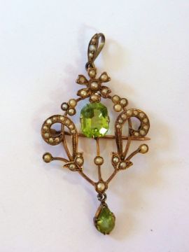 Victorian gold-coloured metal, marked 9ct, peridot and pearl pendan brooch of filigree design
