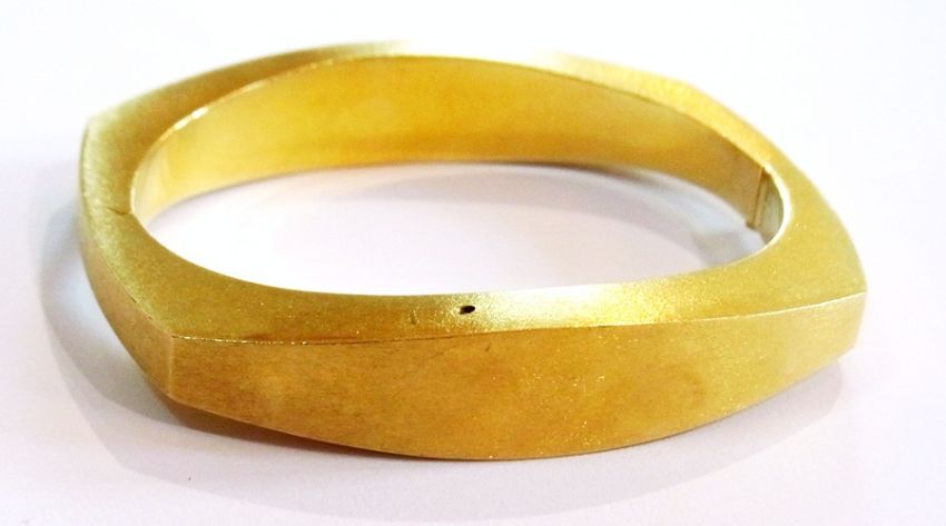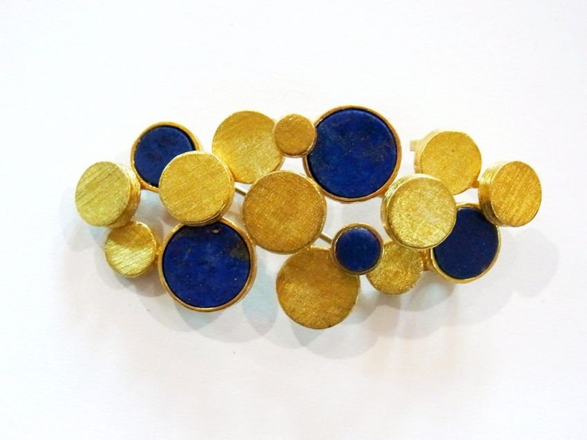 14K modernist style Danish(?) bangle of angular shape and having 14K gold and lapis lazuli attachment/brooch in the form of numerous discs, five set lapis lazuli, stamped variously with initials "EHV" and "TW", total weight 69g gross