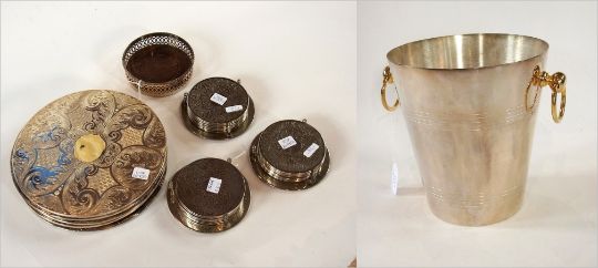 A silver plate ice bucket with ring handles, a wine coaster and various other coasters including three sets