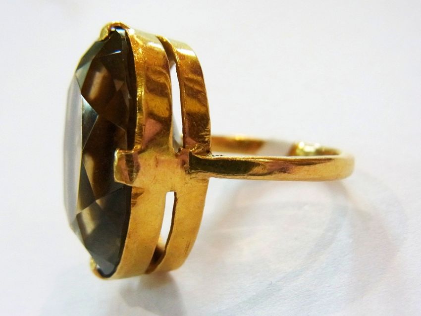 Gold-coloured metal ring set large oval facet-cut smoky quartz