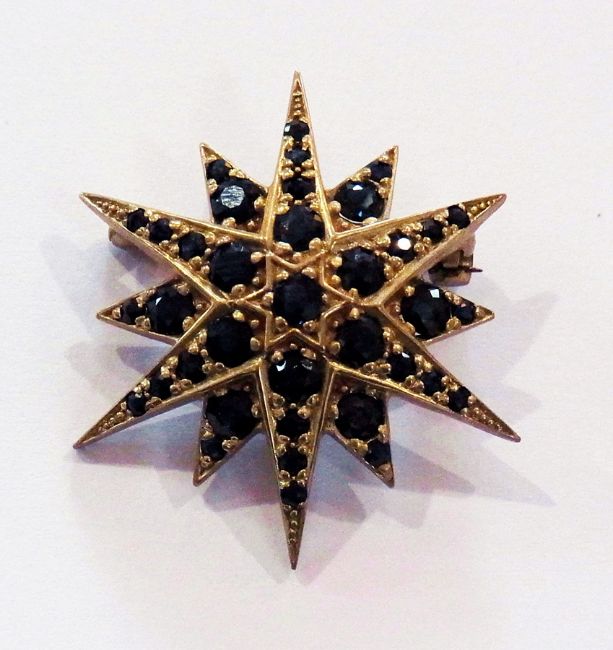Gold and sapphire starburst brooch, the six-pointed star with six alternating points and set numerous graduated and facet cut sapphires, 4cm diameter, 8g approx.