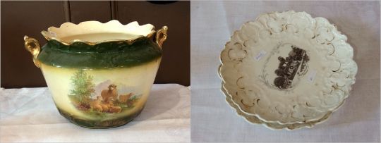 A planter with serpentine rim and a printed scene of sheep, two figures of female and male, seated and two German plates made by Excelsior (5) Live Bidding: The lady has her fingers on both hands broken off, chips and general wear and tear. The seat on the gentleman has missing bits and general wear and tear.