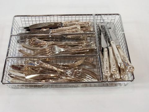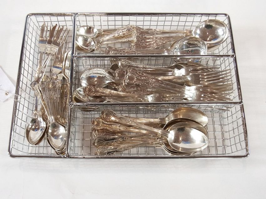 A quantity of silver plate Queens pattern cutlery to include dinner knives and forks, dessert spoons and forks, soup spoons, teaspoons, cake spoons, etc. (12 place settings)