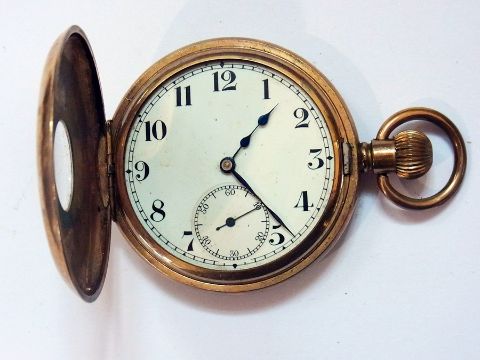 A gentleman's gold plated half hunter pocket watch with enamel dial, subsidiary seconds hand, Swiss movement