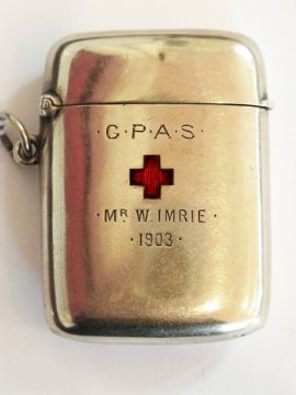 A silver vesta case inlaid with enamel red cross and engraved "G.P.A.S." above and "Mr W Imrie 1903" below, Birmingham 1903 and another with engraved decoration, 2oz approx. (2)
