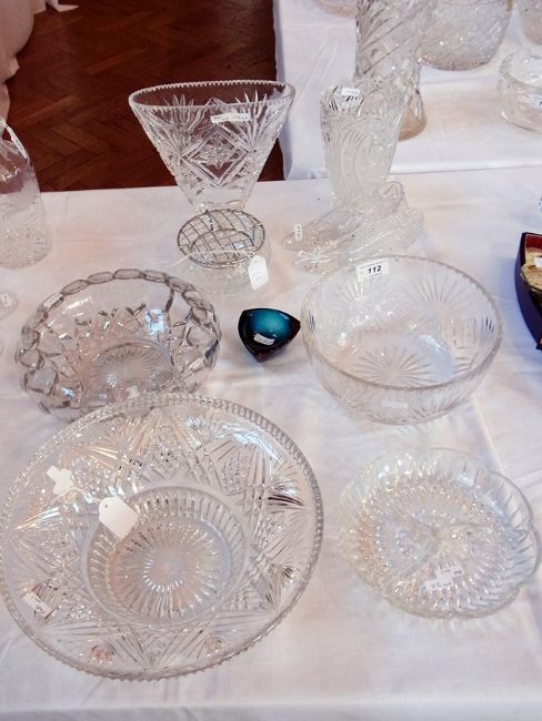 Three large cut glass bowls and other cut glass objects