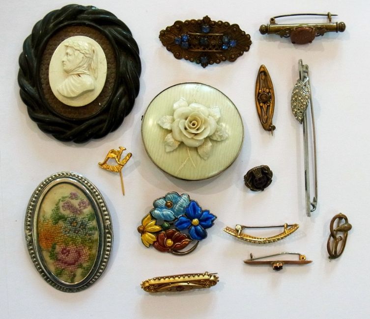 15ct gold and pink stone bar brooch, rounded oblong, gold and seedpearl crescent brooch, graduated, silver and polychrome enamel floral spray brooch, makers AHD&S, Victorian jet portrait brooch, ivory coloured ceramic flowerhead brooch and other jewellery