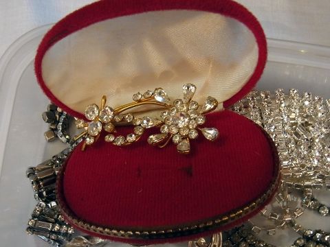 A small amount of diamante jewellery including a necklace, brooches, earrings