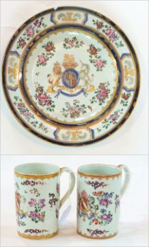 Pair of Armorial porcelain mugs with crest "Sola Virtus Invicta", slip decoration (af), possibly Samson, together with a similar plate (af) pseudo-seal on base (3)