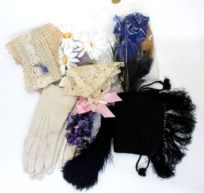 A navy straw Jaeger hat trimmed with white and navy petersham ribbon, a black net sequin and lace lady's muff, a black fox collar, a black lace mantilla and a cream chiffon shawl with tassels (2 boxes and a hat)