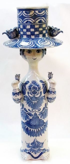 Scandinavian faience model of girl wearing top hat holding tulips, white ground with blue floral decoration, by Bjorn Wiinblad, 52cm high (af) together with a mosaic decorated plate (2) Live Bidding: Restored neck and hat