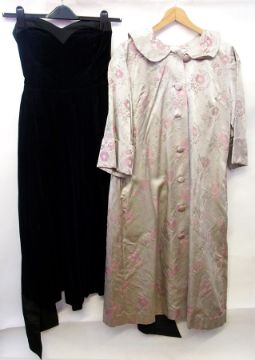 A vintage Laura Ashley black velvet strapless evening gown with tie back and a brocade coat and matching trousers, the coat full length (2)