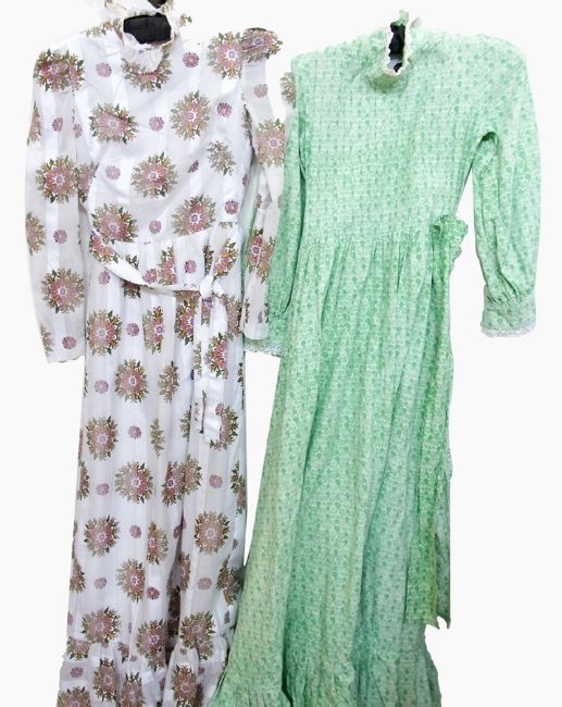 A Laura Ashley full length cotton dress with lace detail to the collar and cuffs, pintucked bodice, frill to hem, with a tie belt, a 1970's Jinty's cotton full length dress with pie-crust collar, leg of mutton sleeves, full length with frill on hem and a tie belt, a cotton maxi skirt, a shift dress in blue and a cotton full length sun dress (5)