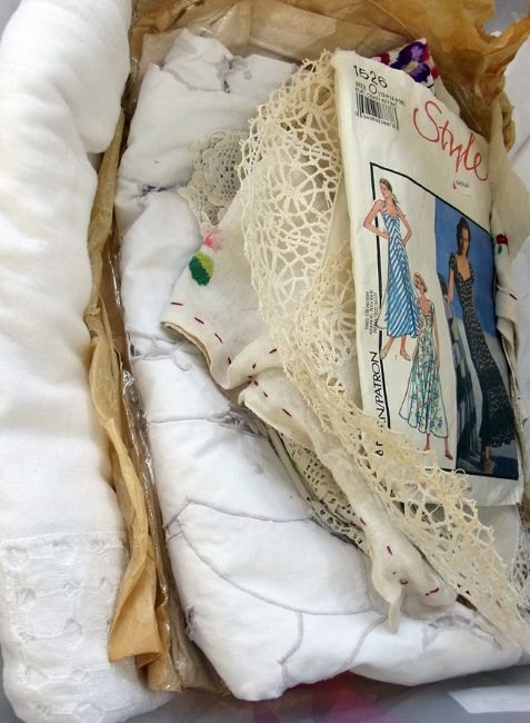 A large cotton tablecloth, other tablecloths, two dress shirts and a Style dress pattern no.1526 (1 box)