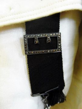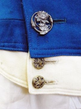 A small boy's pageboy outfit with blue and cream tail jacket with waistcoat and breeks, all the detail with silver buckles and a watch ribbon with a diamante buckle