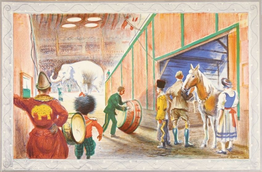 Russell Reeve Colour lithograph "The Elephant Act", Second Series No.17 (1938), depicting circus, onlookers watching the elephant act, 49cm x 75cm Printed in England at the Baynard Press of School Prints Limited, London, SP6