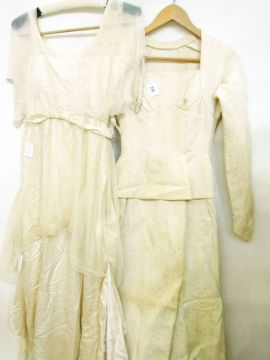 A cream brocade wedding dress, 1954, together with a 1920's satin and chiffon dress made by Debenham & Freebody, a full length satin petticoat and a net petticoat (4)