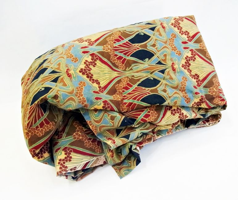 Three Liberty print curtains, lined and interlined, different lengths and a crocheted tablecloth (1 box)