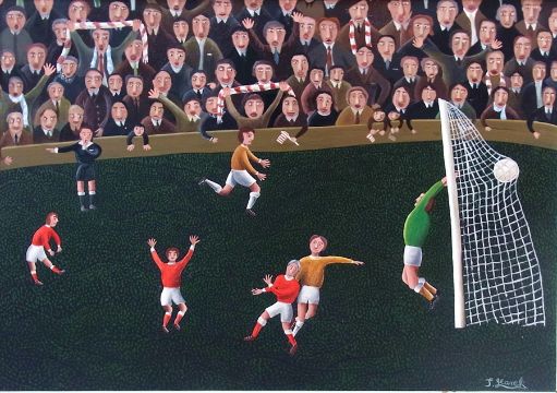Jerzy Marek (b.1925) Oil on board "Arsenal for the Double", Arsenal playing football with spectators in background, signed, labelled and dated to reverse "1970/71", 31cm x 45cm