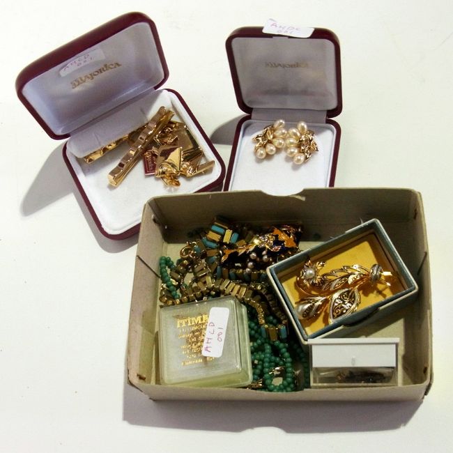 Quantity of gold coloured metal and gilt jewellery, beads, enamel fish brooch, etc.