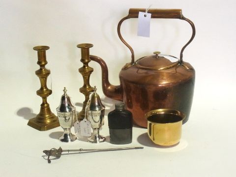 Old copper kettle, various sundry metalware to include candlesticks, dishes, etc.