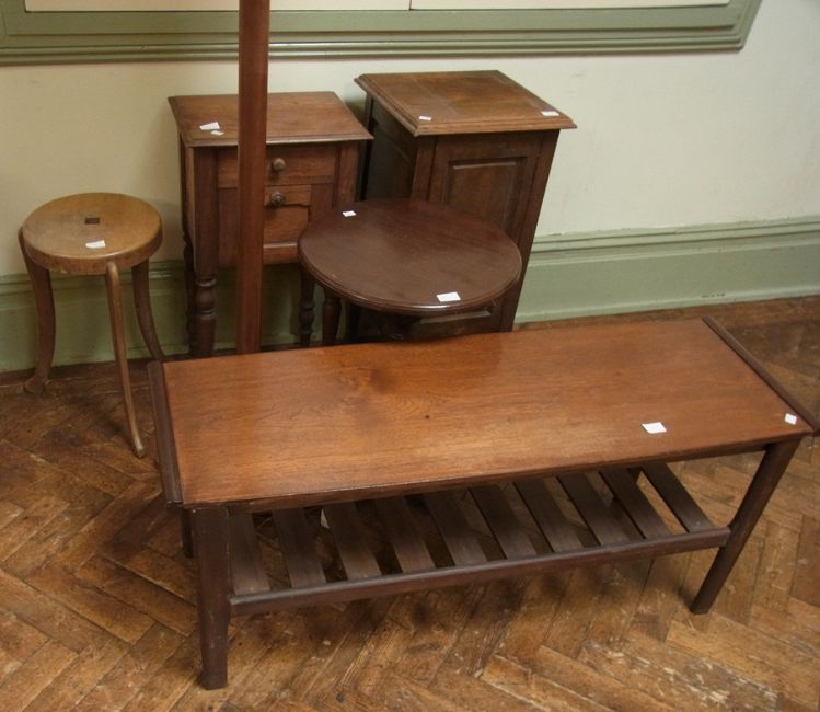 Two various oak bedside commode cupboards, mahogany circular occasional table on carved and turned pillar supports, teak shaped rectangular coffee table, standard lamp and stool
