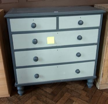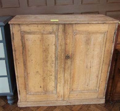A 19th century painted pine chest of two short and three long graduated drawers, on turned feet, width 115cm together with a Victorian pine kitchen cupboard with pair panel doors enclosing shelves, raised on plinth base, width 110cm (2)